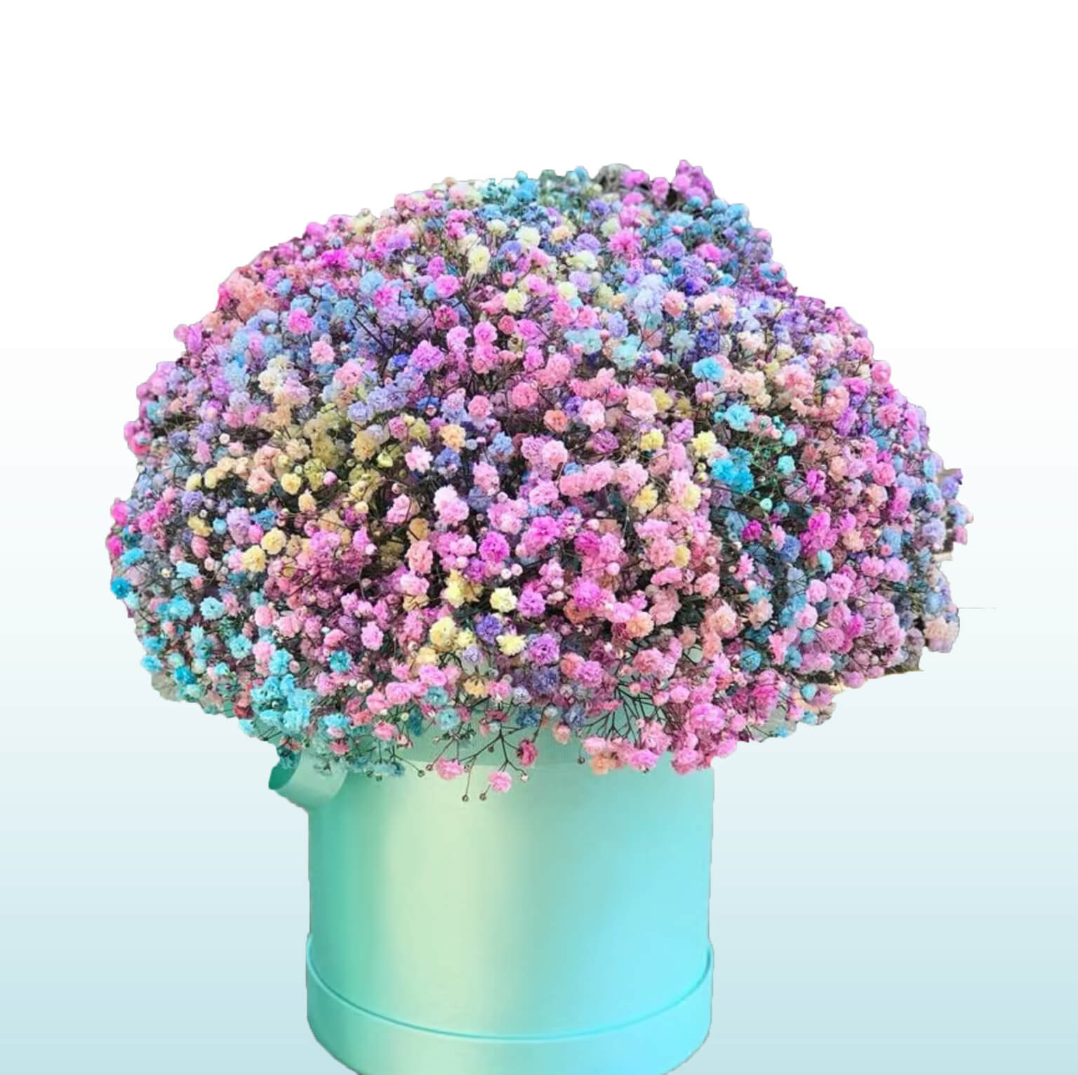 Bohatý, do pastelových barev laděný, květinový box v barevné kombinaci bleděmodré, bílé, jemně růžové, fialové a žluté, který vám bude dělat radost mnohem déle než běžná kytice. (Druhy květin upravíme dle Vašeho přání.) Každý box pro vás připravujeme na zakázku z čerstvých květin.