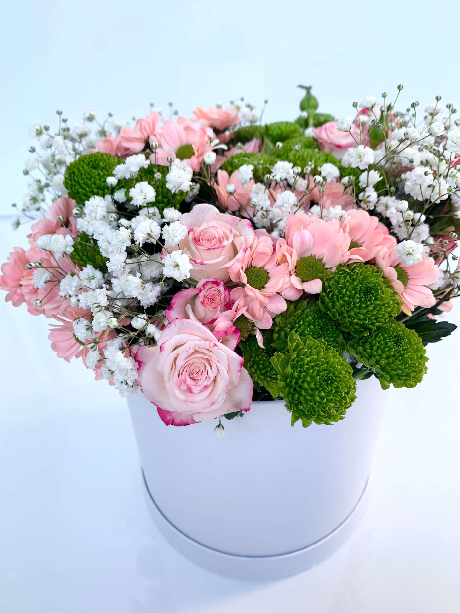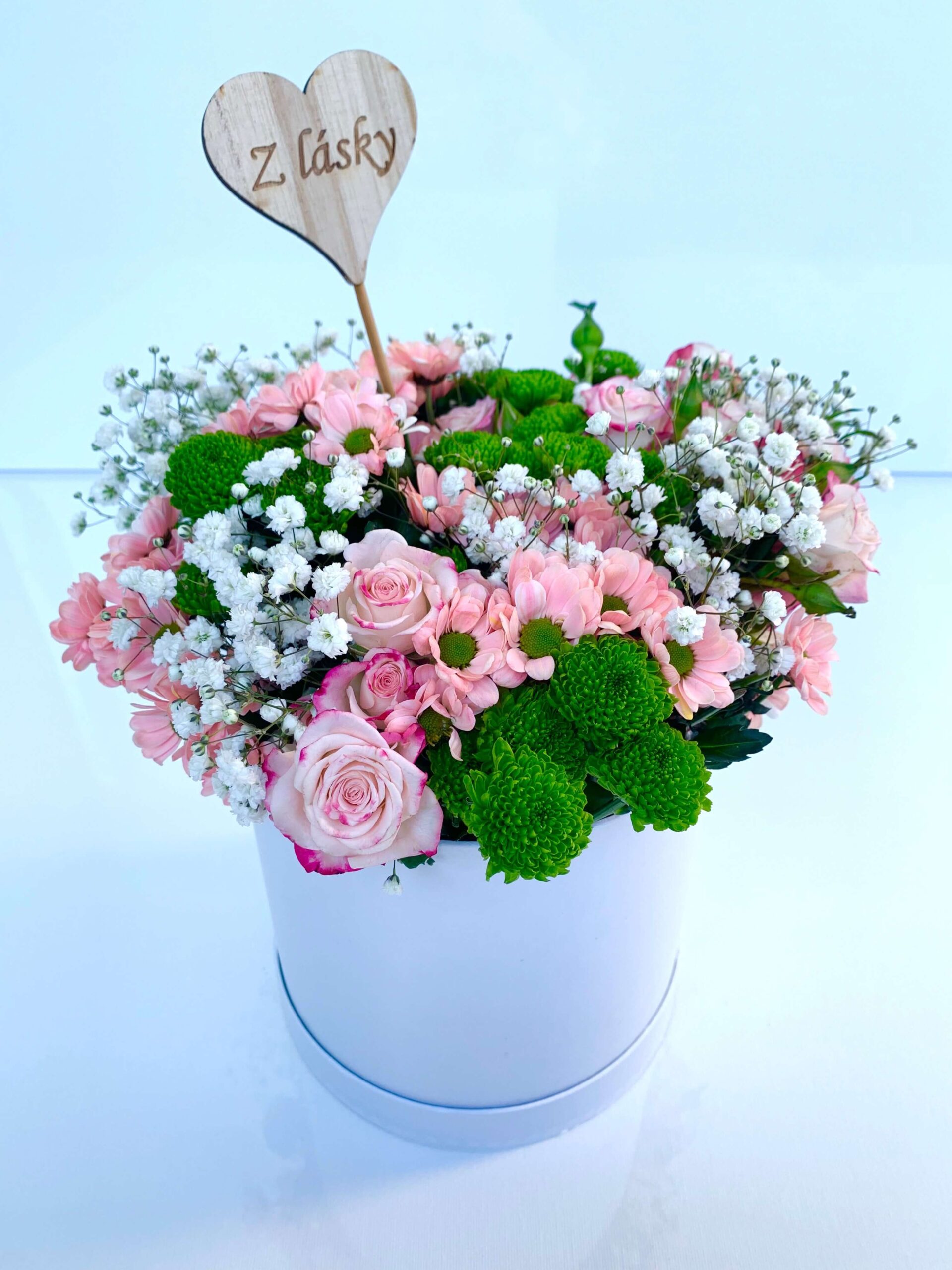 Bohatý květinový box s Růžemi, zelenými Chryzantémami a Nevěstiným závojem, který vám bude dělat radost mnohem déle než běžná kytice. Každý box pro vás připravujeme na zakázku z čerstvých květin.