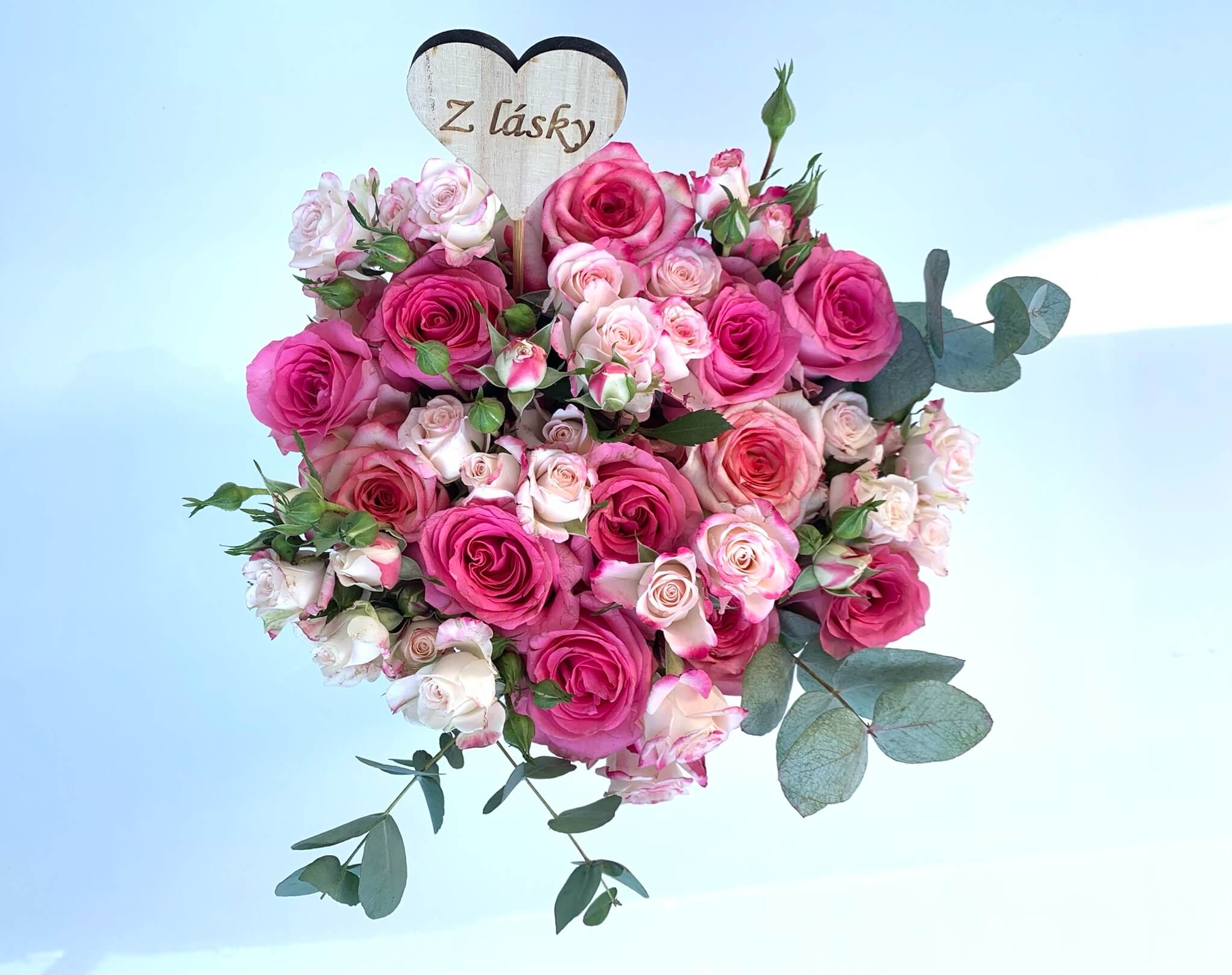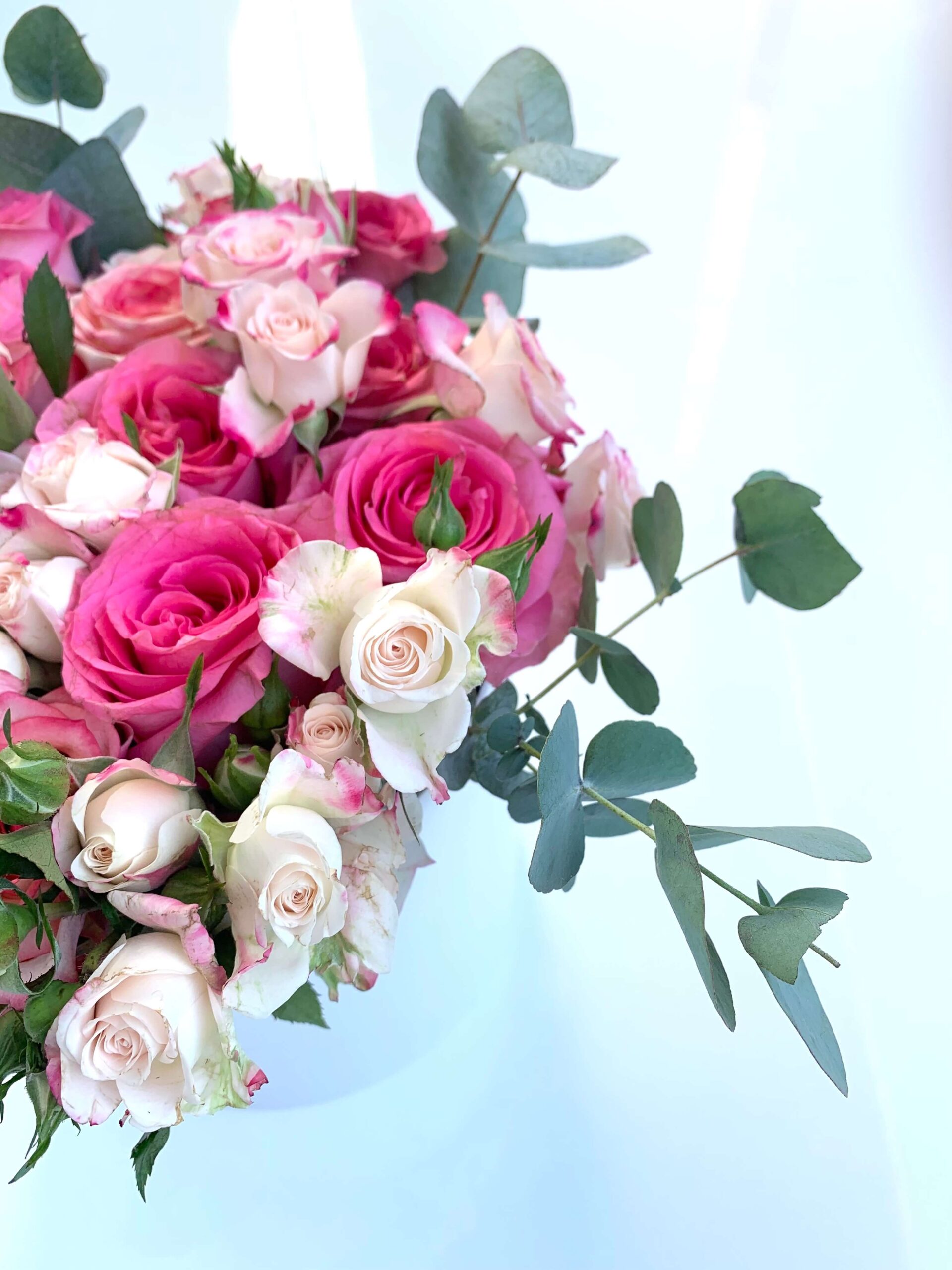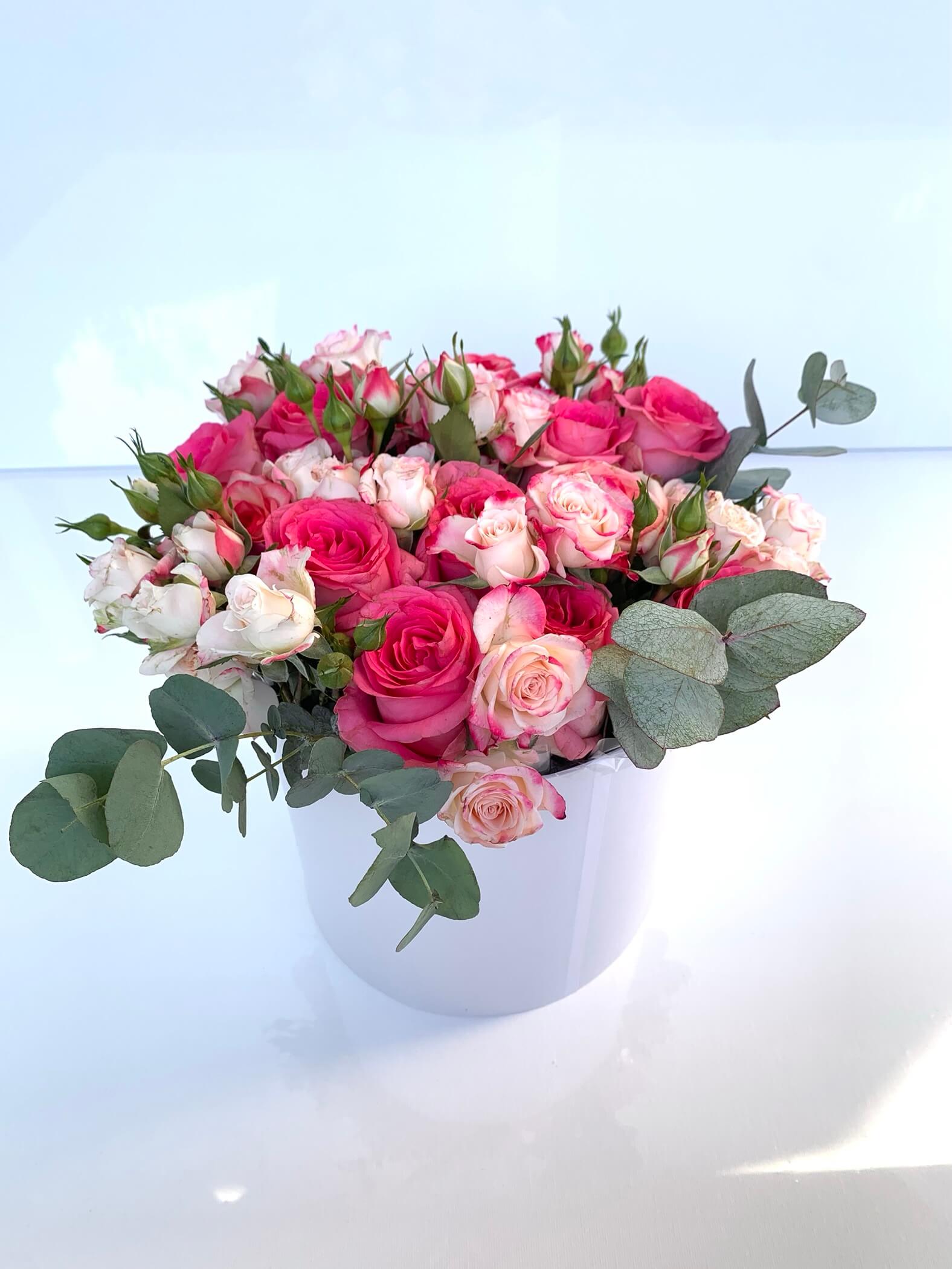 Bohatý květinový box s růžovými Růžemi, trsovými Růžemi a Eukalyptem, tón v tónu, který vám bude dělat radost mnohem déle než běžná kytice. Každý box pro vás připravujeme na zakázku z čerstvých květin.